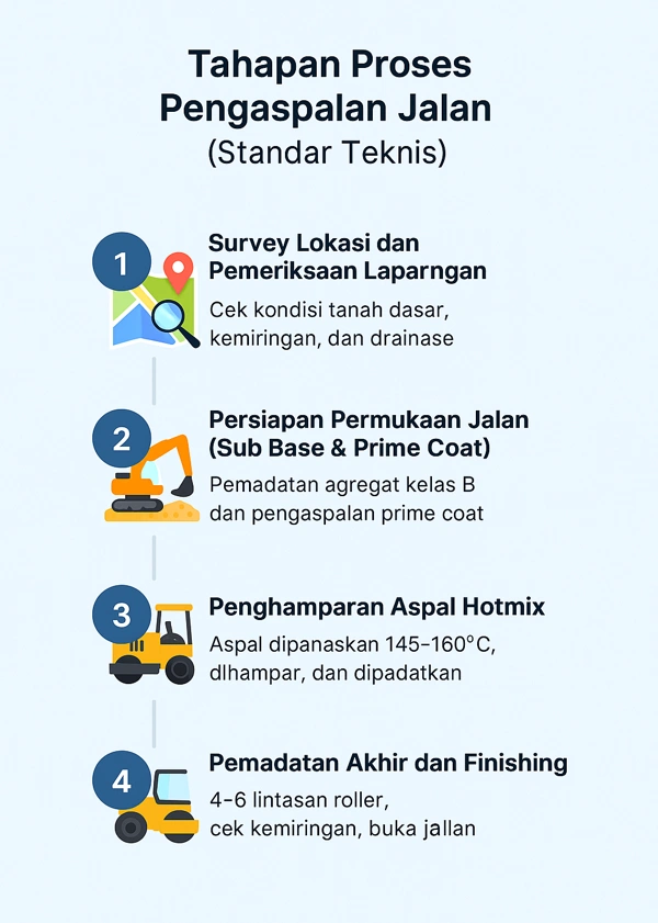 Berikut tahapan umum dalam proses pengaspalan hotmix, mengacu pada spesifikasi dari Direktorat Jenderal Bina Marga – Kementerian PUPR: